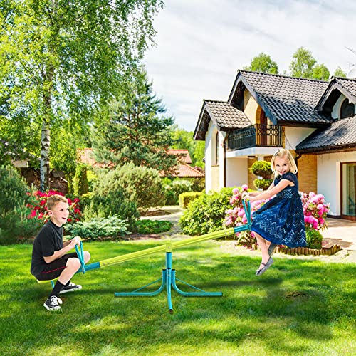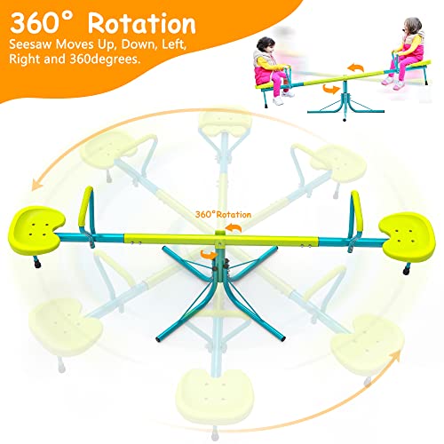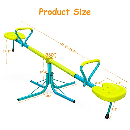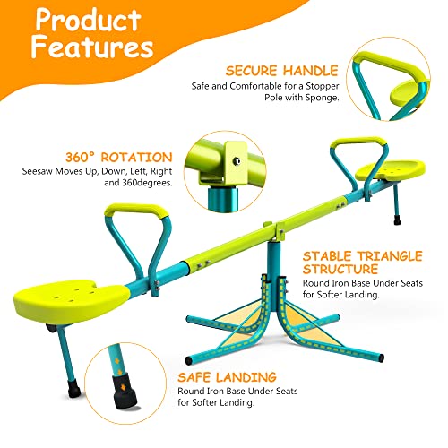 - SPINNING BOUNCING SEESAW: 360 degrees spinning seesaw brings a whole new lot of fun and giggles to the outdoor playground, kids can comfortably sit on, bounce up and down, and spin around and around. Upgraded to hold 110lbs each seat!