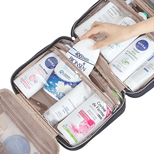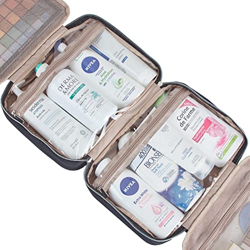 - LARGE CAPACITY - Four clear separate compartments with zippers can hold full-sized toiletries and cosmetics. Coupled with a front pouch, all your daily supplies can be housed in one toiletry bag. Suitbale for your two-week trip.