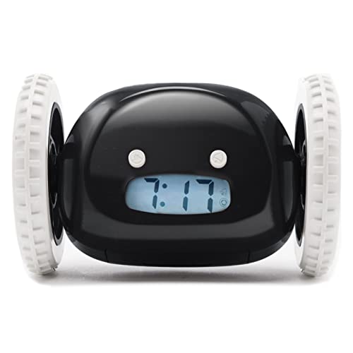 - Alarm Clock on Wheels: The runaway rolling bedside clock that will jump (from up to a 3 foot nightstand), hide, walk, shake, change directions so you wake up to chase and turn off his alarm sound! He is fun, annoying, a bit crazy and a unique gadget guaranteed to get you up on time. Moves on carpet or wood.