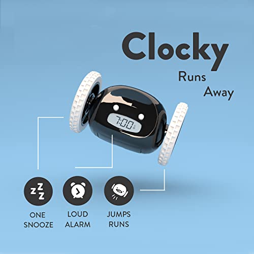 - Easy-to-set time or snooze: You can snooze one time (1-8 minutes), or turn off the snooze feature. Clocky, the digital mobile alarm clock, will light up in the dark and leap into action when it's time to get up and you'll chase it!