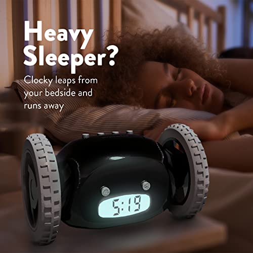 Details: Never over-sleep again! Clocky is the alarm clock on wheels that runs away beeping! You can snooze one time, but if you don't get up, Clocky will jump off of your nightstand up to 3 feet high, and run around your room as if looking for a place to hide. You'll have to get out of bed to silence Clocky's alarm. Clocky beeps in an R2D2-like robotic pattern so that you are sure to hear him. He's kind of like a pet, only he will get you up at the right time! You can set Clocky to run away right when the alarm sounds, or set to snooze one time before he runs away. Clocky features a customizable snooze time up to 9 minutes long. You can also turn off Clockies wheels if you don't want Clocky to run away one morning. A backlight helps you see Clocky at night. Clocky is perfect for those of us who have trouble waking up in the morning! He is compact, clever, and playful. He will never cease to amuse you as you wake up in the morning. This is an authentic Clocky alarm clock by the original designers of the product, Nanda Home Inc.