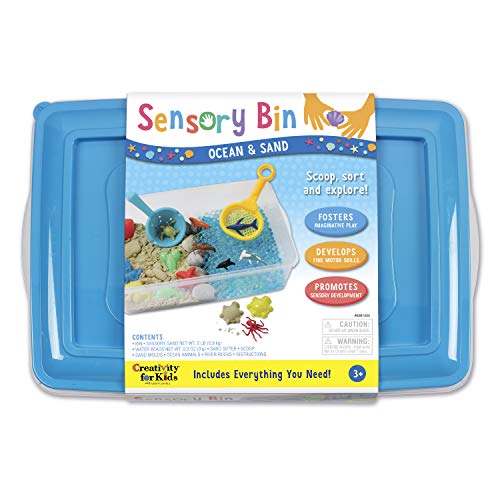 Details: Dive into an ocean and sand adventure with a self-contained beach environment filled with fascinating water beads, 2 lbs of easy to mold play sand, ocean toys and more! This self-contained play bin is the ultimate sensory experience! Creativity for Kids Sensory Bins allow children to discover, imagine, learn and create, while engaging their senses and having FUN! Materials are carefully selected (and safety-tested!) to provide the best hands-on play experience. Scoop, sort and explore in this self-contained sensory bin. Sensory Bins provide many learning benefits and resources for children to build find motor skills, promote sensory development and encourage imaginative play. For easy cleanup, place your sensory bin on a table cloth, towel or play mat and scoop, sort, dig and build for endless hours of hands-on imaginative play! All sensory bin fillers are carefully selected and safety tested to provide the best at home play activity. Complete play set includes 2 lbs of soft sensory sand, water beads, ocean animal toys and a variety of sensory tools all conveniently packed in a bin with lid for easy storage (Bin measures approx. 14.5" W x 10.25" L x 4.75" H). When your family is done playing and engaging with the sensory bin upcycle it by planting flowers or storing small toys and keepsakes inside, crafters can also recycle their bin to do their part in saving our Earth! Have fun while building creative confidence! Since 1976, Creativity for Kids has proudly made fun and creative experiences today to nurture children's confidence for life. The Creativity for Kids Sensory Bin - Ocean and Sand is recommended for ages 3+