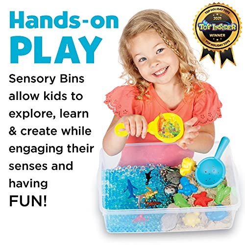 - JUST ADD IMAGINATION - Complete play set includes 2 lbs of soft sensory sand, water beads, ocean animal toys and a variety of sensory tools all conveniently packed in a bin with lid for easy storage (Bin measures approx. 14.5" W x 10.25" L x 4.75" H)
