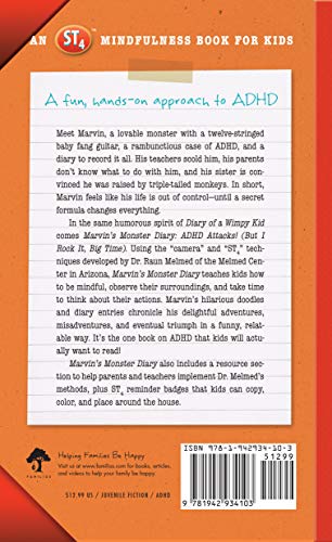Details: Product Description Meet Marvin, a lovable monster with a twelve-stringed baby fang guitar, a rambunctious case of ADHD, and a diary to record it all. His teachers scold him, his parents don't know what to do with him, and his sister is convinced he was raised by triple-tailed monkeys. In short, Marvin's life is feeling out of control—until a secret formula changes everything. In the same humorous spirit of Diary of a Wimpy Kid comes Marvin's Monster Diary: ADHD Attacks! (And I Rock It, Big Time). Using the "monstercam" and "ST4" techniques developed by Dr. Raun Melmed of the Melmed Center in Arizona, Marvin's Monster Diary teaches kids how to be mindful, observe their surroundings, and take time to think about their actions. Marvin's hilarious doodles and diary entries chronicle his delightful adventures, misadventures, and eventual triumph in a funny, relatable way. It's the one book on ADHD that kids will actually want to read! Marvin's Monster Diary also includes a resource section to help parents and teachers implement Dr. Melmed's methods, plus ST4 reminders that kids can remove, color, and place around the house. Review "Marvin's Monster Diary: ADHD Attacks has recently been added to my arsenal. It has been a terrific tool for my younger clients as it has helped them open up about their own struggles with ADHD. The book has given them new skills and tools to cope with their challenges . . . Thank you so much for this simple and fun book that both coaches and parents can use effectively with their respective clients or children." —Allison Burns, ACC and ADHD coach About the Author Raun D. Melmed, MD, FAAP, a developmental and behavioral pediatrician, is the director of the Melmed Center in Scottsdale, Arizona, and co-founder and medical director of the Southwest Autism Research and Resource Center. He is the author of Autism: Early Intervention; Autism and the Extended Family; and a series of books on mindfulness for children: Marvin's Monster Diary: ADHD Attacks, Timmy's Monster Diary: Screen Time Stress, Harriet's Monster Diary: Awfully Anxious, Marvin's Monster Diary 2 (+Lyssa): ADHD Emotion Explosion, Marvin's Monster Diary 3: Trouble with Friends (But I Get By, Big Time!), and the next in the series, and Marvin's Monster Diary 4: Bullying. Annette Sexton graduated from Brigham Young University with a BA in English. Diagnosed with ADHD at age ten, she is excited to be a part of helping kids face and overcome some familiar challenges. Annette also studied music and enjoys playing the piano and French horn. She loves reading, crocheting, and being a mother to two beautiful, busy little girls. She lives in Ithaca, New York, with her husband and their two daughters. Jeff Harvey grew up in northern California doing nothing but making art. Since then, he has graduated from BYU in illustration and moved to Utah, where lives with his wife and family, still doing nothing but making art.