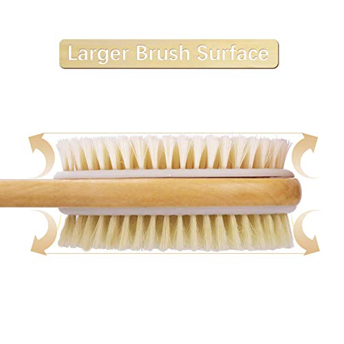 Metene Shower Brush with Soft and Stiff Bristles ,for Exfoliating Skin and A Soft Scrub ,Double-sided Brush Head for Wet or Dry Brushing ,Specially Long Wooden Handle Cleans the Body Easily