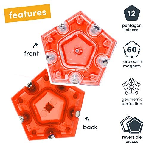 Details: A fidget sphere of magnetic pentagons that magically assembles every time. Clear on one side, color on the other, this geometric desk toy is a never ending source of satisfying fun. Build a shape, smash and repeat!