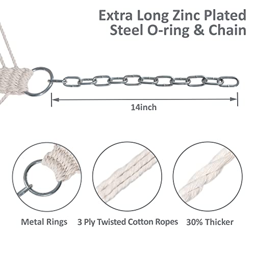 - Handcrafted Ropes: The heavy duty cotton ropes are hand-woven with comfortable, long-lasting threads woven by the hammock artisans. The 20 ropes are collected together and woven into a triangle pattern which is pleasing to the eye. O-shaped steel ring attaches the ropes and the chain.