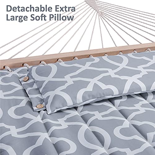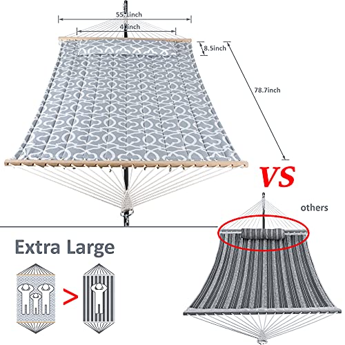 - Comfortable and Non-fading: Two-layer 100% quilted polyester fabric with poly fiber filling, cozier and best for camping and the outdoors. Compared with other quilted hammocks, it will not fade after long-term use. A polyethylene-stuffed head pillow offers superior comfort. You can even set your preferred height by hooking the suitable chain section to the holes on the stand.