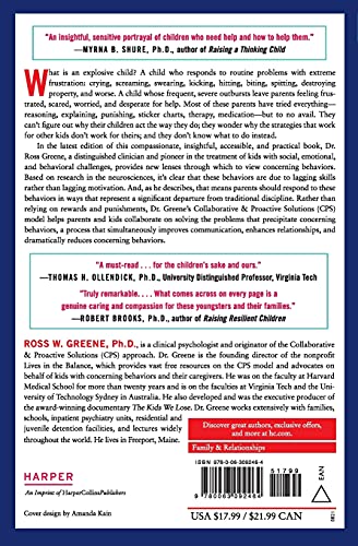 Details: Product Description Now in a revised and updated 6th edition, the groundbreaking, research-based approach to understanding and parenting children who frequently exhibit severe fits of temper and other challenging behaviors, from a distinguished clinician and pioneer in the field. What’s an explosive child? A child who responds to routine problems with extreme frustration—crying, screaming, swearing, kicking, hitting, biting, spitting, destroying property, and worse. A child whose frequent, severe outbursts leave his or her parents feeling frustrated, scared, worried, and desperate for help. Most of these parents have tried everything-reasoning, explaining, punishing, sticker charts, therapy, medication—but to no avail. They can’t figure out why their child acts the way he or she does; they wonder why the strategies that work for other kids don’t work for theirs; and they don’t know what to do instead. Dr. Ross Greene, a distinguished clinician and pioneer in the treatment of kids with social, emotional, and behavioral challenges, has worked with thousands of explosive children, and he has good news: these kids aren’t attention-seeking, manipulative, or unmotivated, and their parents aren’t passive, permissive pushovers. Rather, explosive kids are lacking some crucial skills in the domains of flexibility/adaptability, frustration tolerance, and problem solving, and they require a different approach to parenting. Throughout this compassionate, insightful, and practical book, Dr. Greene provides a new conceptual framework for understanding their difficulties, based on research in the neurosciences. He explains why traditional parenting and treatment often don’t work with these children, and he describes what to do instead. Instead of relying on rewarding and punishing, Dr. Greene’s Collaborative Problem Solving model promotes working with explosive children to solve the problems that precipitate explosive episodes, and teaching these kids the skills they lack. Review “The Explosive Child is a must for the many parents, teachers, and professionals who attempt to guide, teach, and work with difficult, hard-to-manage, and easily frustrated children. . . . A must-read for our children’s sake and ours.” — Thomas H. Ollendick “A truly remarkable book. . . . Dr. Greene skillfully provides us with both a framework and practical interventions for minimizing struggles with these children and enhancing their development. . . . What comes across on every page of this wonderful book is a genuine caring and compassion for these youngsters and their a families.” — Robert Brooks, Ph.D. , author of The Self-Esteem Teacher “An insightful, sensitive portrayal of children who need help—and how to help them.” — Myrna B. Shure “A user-friendly, practical guide for parents trying to help difficult, explosive children. This book will be of enormous benefit to such children and their families.” — Michael Jellinek “All parents should read this book, especially those with children who are out of control. Ross Greene presents a loving, rational, and research-based approach to dealing with problems that most parents have either felt were their own fault or were unsolvable. I could not recommend this book more highly.” — Edward Hallowell, M.D., author of Driven to Distraction About the Author Ross W. Greene, Ph.D., is the originator of the Collaborative & Proactive Solutions (CPS) model described in this book, an approach he has researched extensively, along with colleagues throughout the world. Dr. Greene served on the faculty at Harvard Medical School for over 20 years, and is currently Founding Director of the non-profit Lives in the Balance and adjunct Associate Professor in the Department of Psychology at Virginia Tech. He consults extensively to families, schools, and therapeutic facilities and lectures widely internationally. Vast free resources on the CPS approach can be found on the Lives in the Balance website (www.livesinthebalance.org).